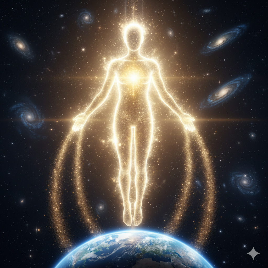 - 묘사: 지구를 발아래 두고 우주 공간으로 뻗어 나가는 빛나는 존재(신). 그 존재의 가슴 안에는 황금빛 지식의 입자들이 가득 차 있고, 손끝에서 나온 빛이 인류 전체를 따뜻하게 감싸 안는 모습. (신성하고 웅장한 느낌의 디지털 아트 스타일)