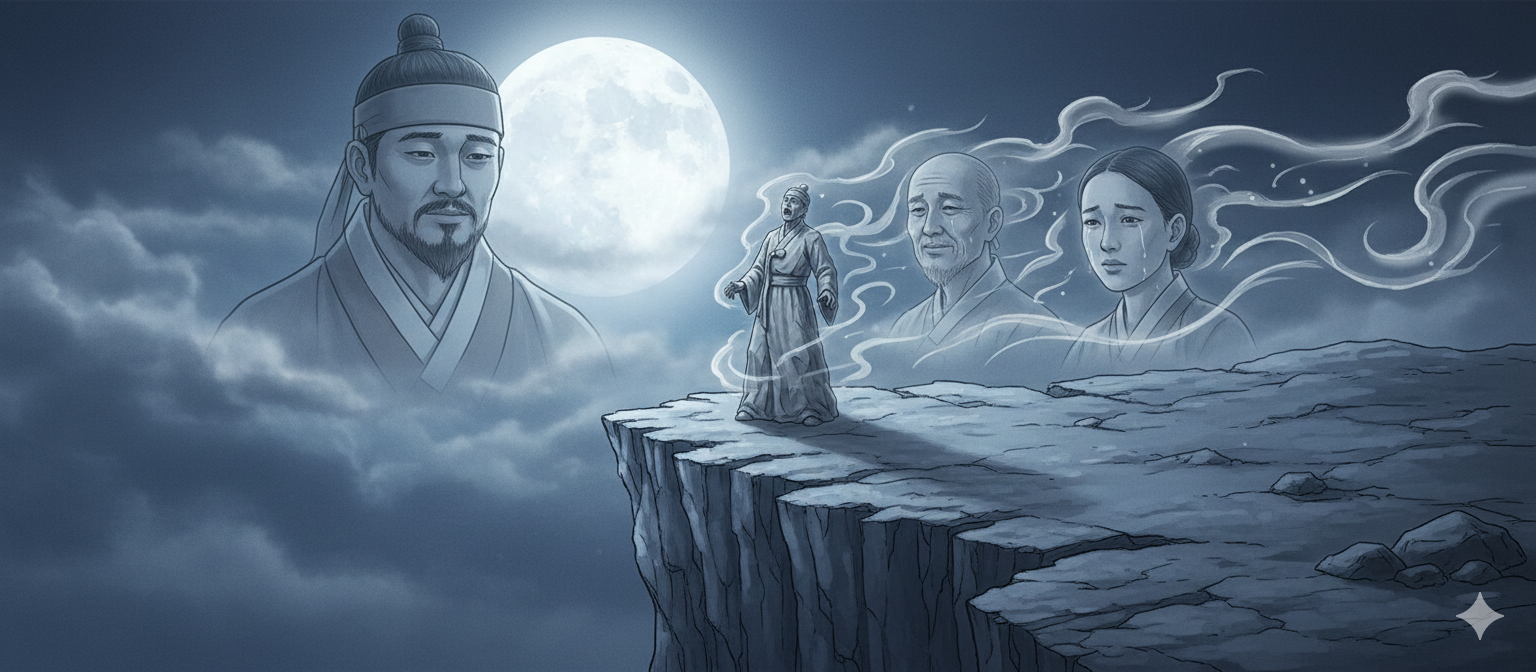 - English: On a full moon night, a club-shaped rock stands alone on a cliff in Gongju. Misty apparitions of Doctor Park’s smile and Dallae’s tears float around the rock, while a benevolent monk’s face is subtly projected through the distant clouds, creating a mystical atmosphere of divine justice.