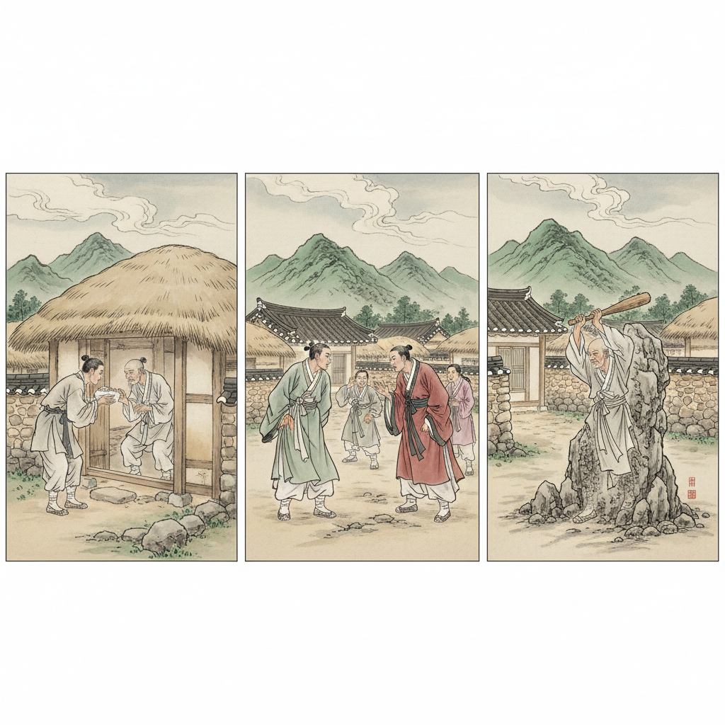 [English] [Folktale Summary Image] A triptych panorama in traditional East Asian art style. (Left) A greedy young man in worn Hanbok refuses a starving old monk. (Middle) The man in flashy silk robes falsely accuses a doctor and threatens a scared maiden. (Right) The dramatic moment the man with a club turns into a gray rock while attacking the monk. Ancient Gongju village background.