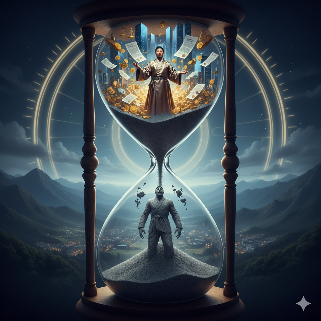 [한글] 거대한 모래시계 형상을 중심으로 한 초현실적인 구성입니다. 모래시계의 윗부분에는 현대적인 도시의 욕망(금전, 계약서, 화려한 건물)이 휘몰아치고 있으며, 그 중심에 비단옷을 입은 남자가 오만하게 서 있습니다. 그러나 모래시계의 좁은 통로를 지나 아래로 떨어지는 순간, 그 모든 욕망은 무거운 회색 모래가 되어 남자의 발등부터 덮쳐오며 그를 거대한 바위로 응고시킵니다. 배경에는 공주의 아름다운 산하와 대조적인 인과응보의 수레바퀴가 은은하게 빛나며 '시간과 업보'의 엄중함을 시각화합니다.
