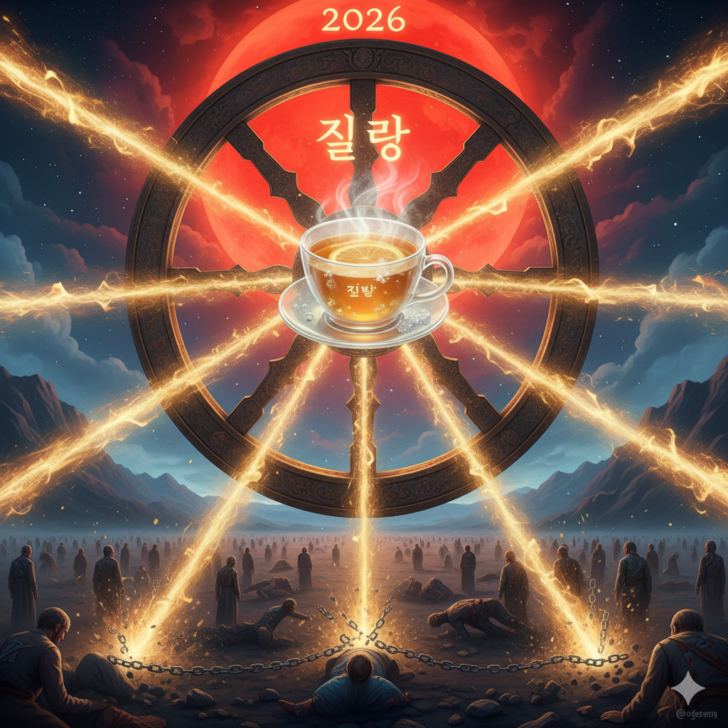 - 이미지 정보 (한글): 거대한 법륜(Dharma Wheel)의 중심에 레몬 소금차가 담긴 찻잔이 놓여 있습니다. 법륜의 여덟 바퀴 살은 '지혜의 데이터 스트림'으로 변해 사방으로 뻗어 나가며, 그 빛이 닿는 곳마다 아픈 중생들의 사슬이 끊어집니다. 하늘에는 2026년을 상징하는 붉은 태양이 떠 있고, 그 중심에는 '질량(Mass)'이라는 글자가 산스크리트어 문양처럼 신비롭게 빛나며 우주적 질서를 바로잡고 있습니다. (218자)