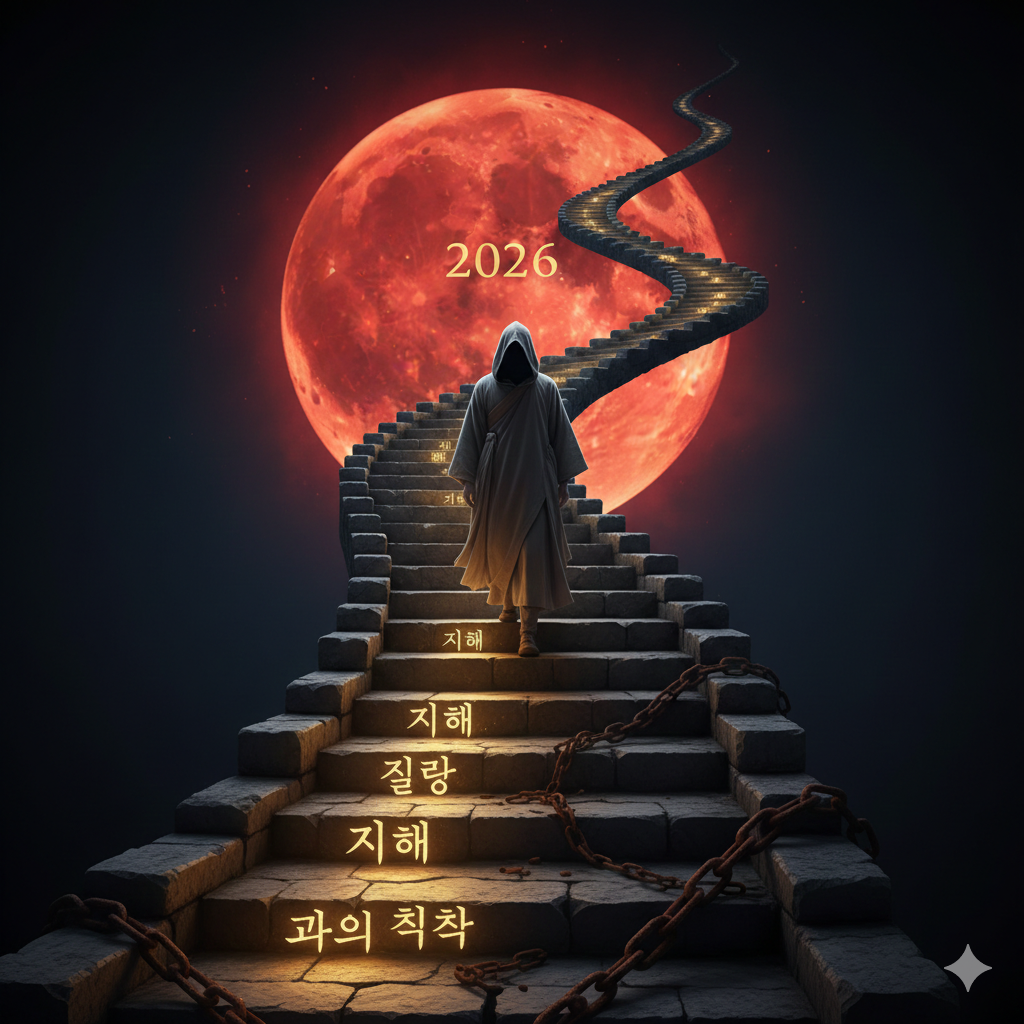 - 이미지 정보 (한글): 깊은 밤, 한 수행자가 등불을 들고 끝이 보이지 않는 계단을 오르고 있습니다. 수행자가 밟는 계단마다 '지혜'와 '질량'이라는 글자가 황금빛으로 빛나며 주변의 어둠을 밝힙니다. 뒤편에는 2026년의 붉은 보름달이 떠 있어 새로운 시대의 질서를 상징하며, 발치에 놓인 무거운 쇠사슬(과거의 집착)은 끊어져 흩어져 있는 장엄하고 희망찬 풍경입니다. (215자)