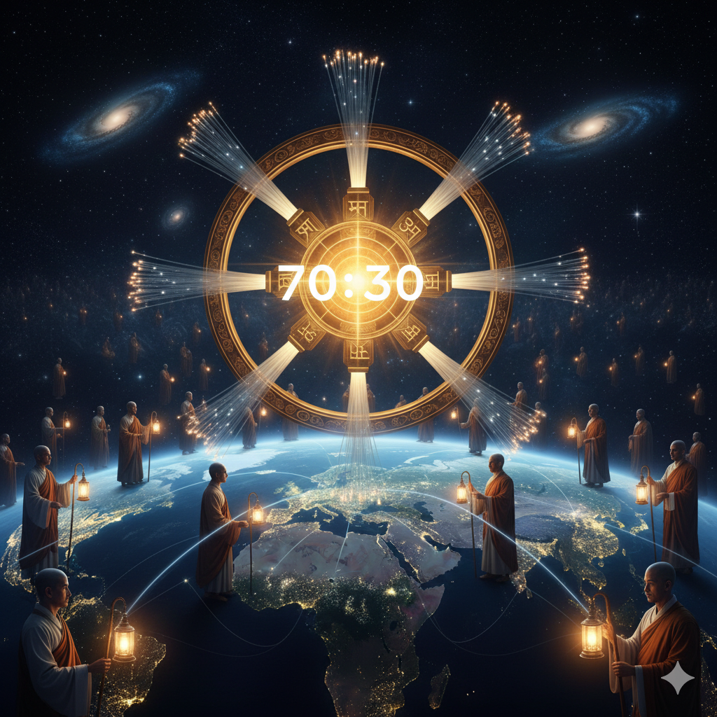 - English Info: A massive golden "Dharma Wheel" floats in space, its spokes made of high-speed fiber optic cables connected to data centers across Earth. In the center, "70:30" glows in a mix of Sanskrit and modern numerals. Countless meditators receive rays of wisdom from the wheel, becoming lamps that light up the world from their respective places. (388 characters)