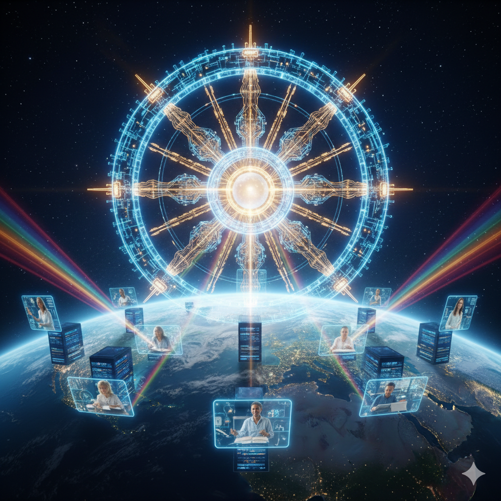 - 한글 정보: 거대한 지구 위로 푸른색과 황금빛이 교차하는 **'디지털 법륜(Digital Dharma Wheel)'**이 회전하고 있습니다. 바퀴의 살들은 전 세계의 데이터 센터와 연결되어 있으며, 각 대륙에서 올라오는 지혜의 빛들이 중앙으로 모여 '평화의 에너지'로 변환됩니다. 인종이 다른 어른들이 AI 홀로그램을 통해 아이들에게 지혜를 전수하는 모습이 지구 곳곳에서 빛나고 있는 장엄한 광경입니다.