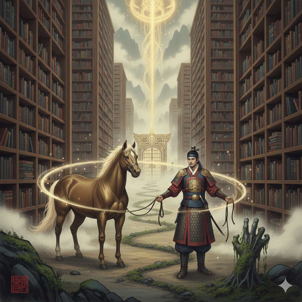[English] Mountain ranges stretch between the shelves of a vast library, and a warrior releases the reins of a bronze horse. The released reins become streaks of light ascending to heaven, while the warrior walks empty-handed into a misty gate of wisdom. Beneath his feet, the moss-covered hand of a thief who turned to stone, unable to bear the weight of desire, is visible. The entire piece is a grand surrealist artwork visualizing the "wisdom of filling through emptying."