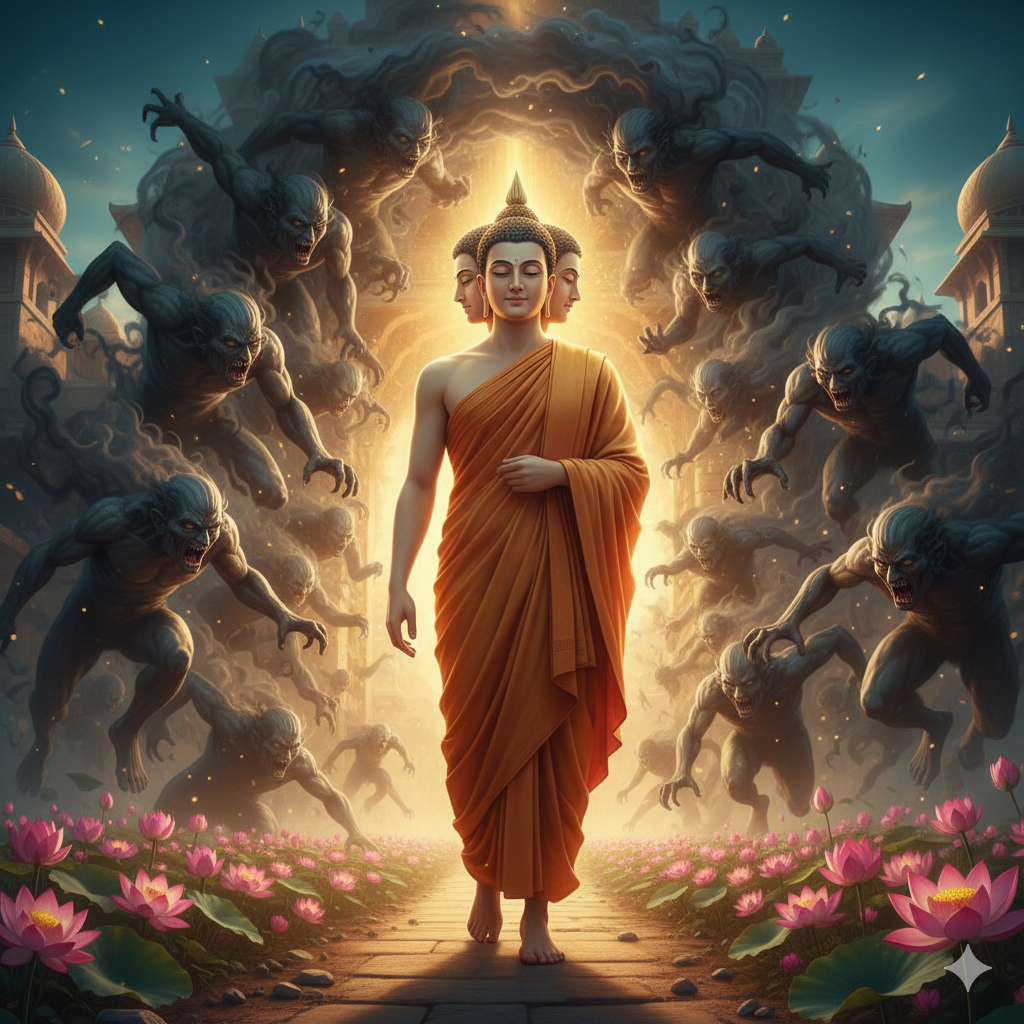 - English: Demons in the form of dark clouds fleeing the city to avoid the Buddha's light. The Buddha walks calmly between two kingdoms, with flowers blooming in his wake. He wears traditional Indian monastic attire neatly.