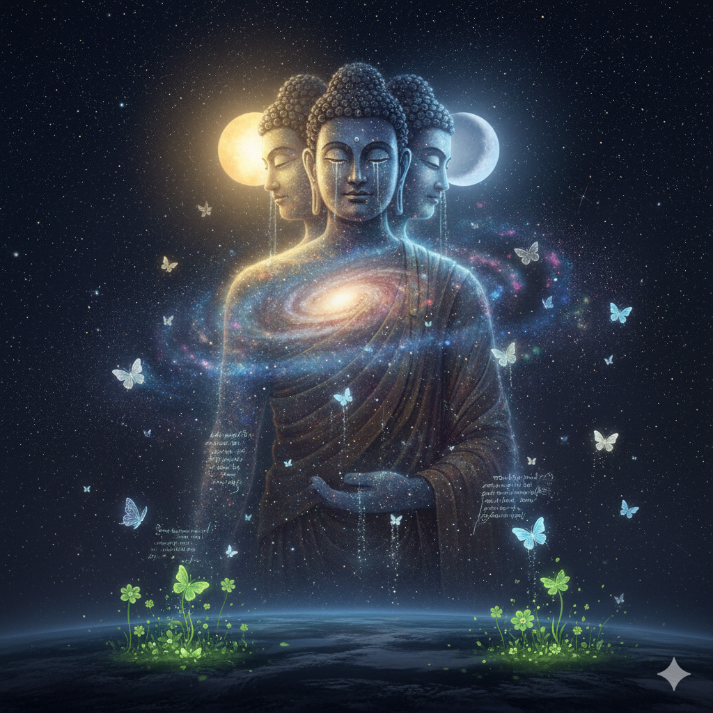 - 한글: 밤하늘의 은하수가 부처님의 형상을 이루고 있으며, 두 개의 머리는 각각 해와 달처럼 빛나고 있다. 부처님의 눈에서 흐르는 눈물은 대지로 떨어져 푸른 싹을 틔우고, 그 위로 방금 지은 시 구절들이 나비가 되어 날아다닌다. 평온하고 몽환적인 분위기 속에 부처님은 자비로운 미소를 지으며 온 우주를 품에 안고 계신다.