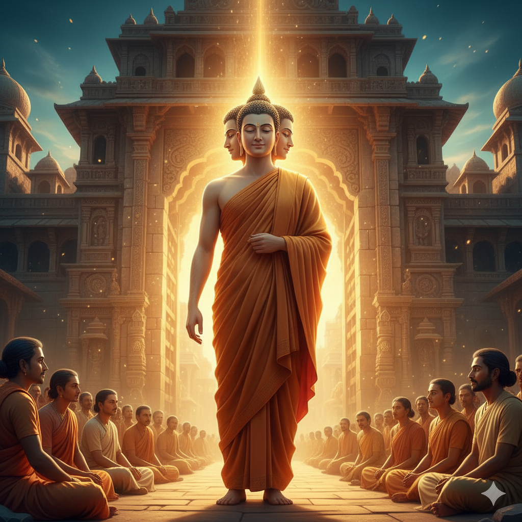 - 한글: 고대 인도의 비사리 성문 앞에 서서 위엄 있게 설법하시는 부처님의 모습. 밝은 빛이 부처님으로부터 뿜어져 나오며, 주변의 공기가 맑게 정화되는 느낌. 부처님은 정교한 주름이 잡힌 황토색 가사를 입고 계심.