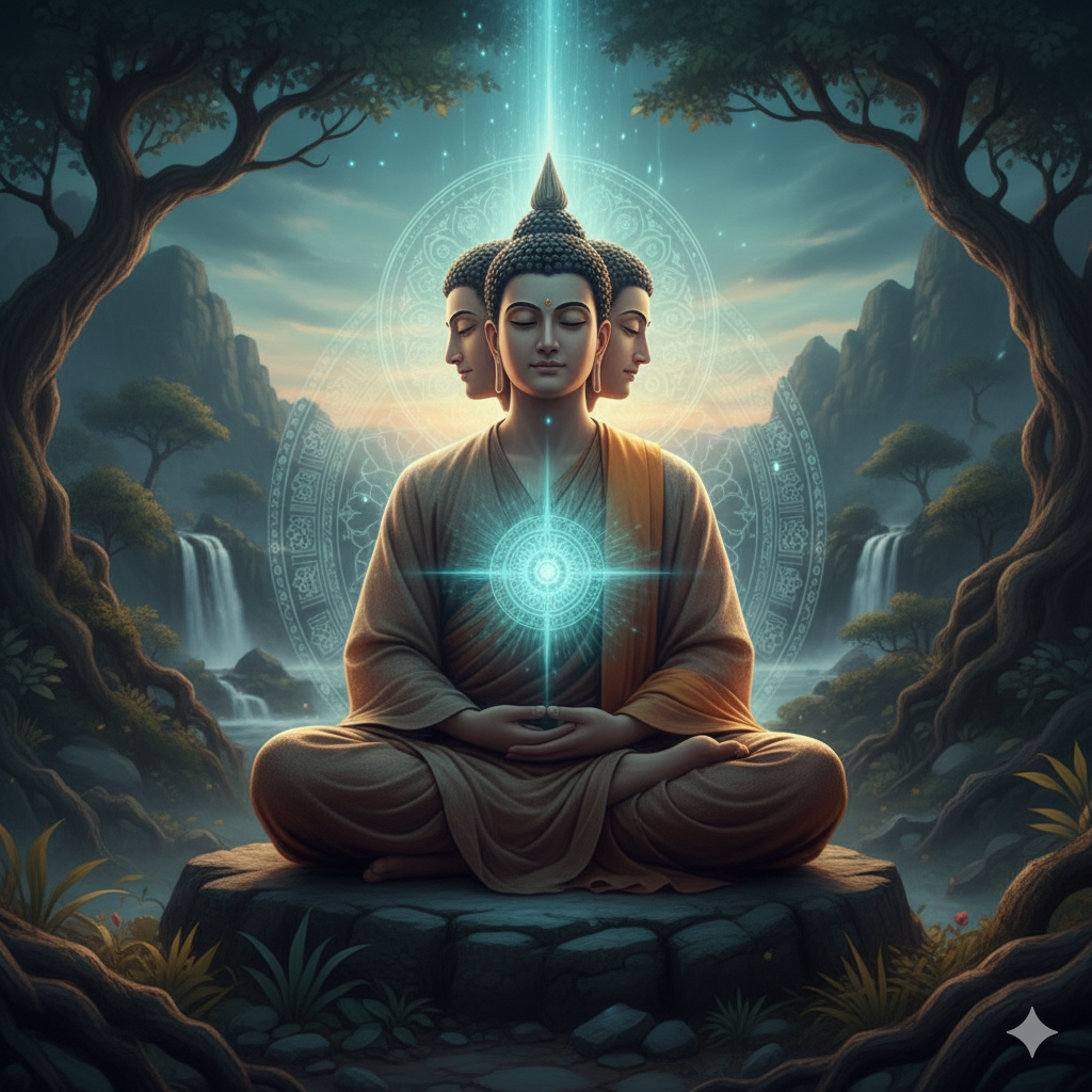 - English: Buddha with a solemn expression, appearing as if in deep meditation. His eyes reflect a resolute will, and a blue light of compassion spreads from his chest. He sits on a rock in simple monastic robes.