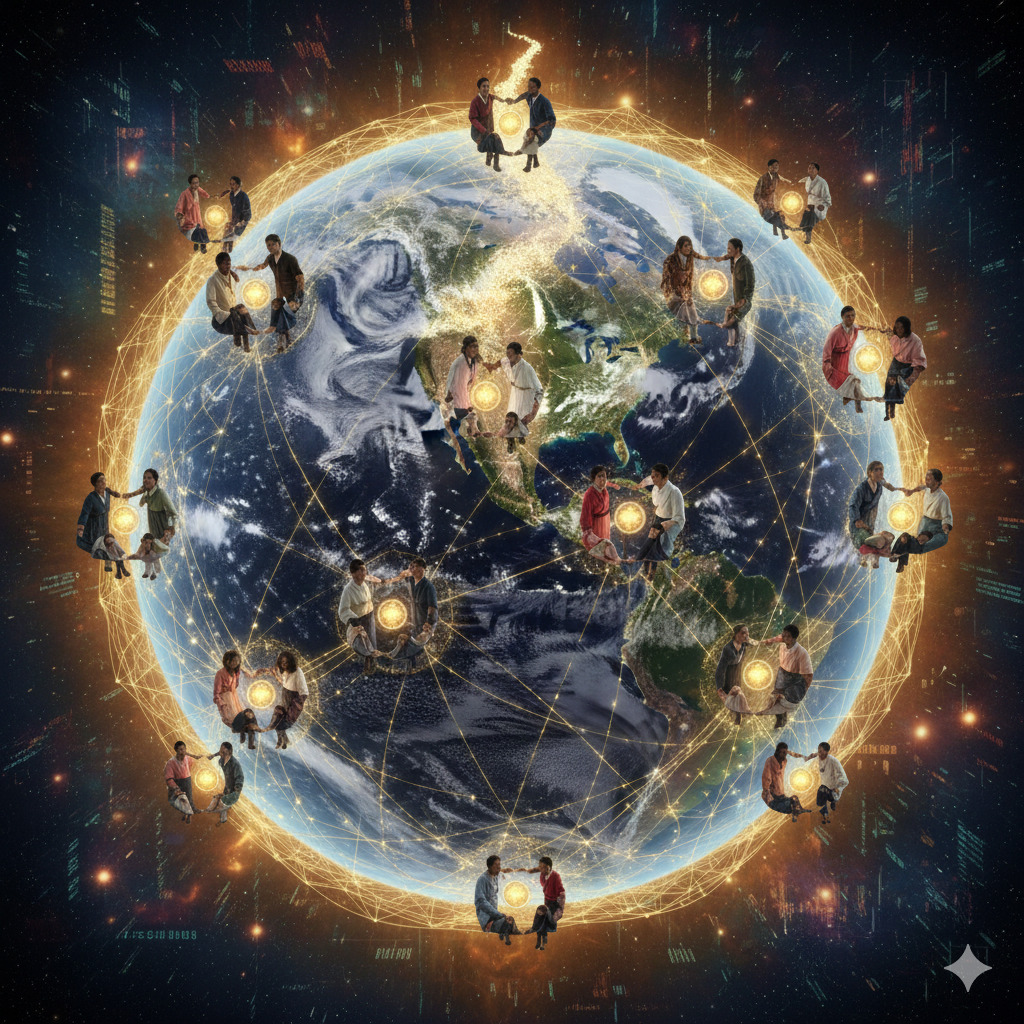 [글로벌 확장 이미지 생성 정보] 한글: 지구 전체가 거대한 신경망처럼 황금빛 선들로 연결되어 있고, 그 중심축이 한반도에서 뻗어 나오고 있습니다. 각 연결 노드(도시)마다 다양한 인종의 사람들이 서로의 손을 잡고 빛나는 '인성 구슬'을 공유하고 있으며, 배경에는 우주의 성운과 현대적인 데이터 스트림이 융합된 장엄한 풍경입니다. English: The entire Earth is connected by golden lines like a giant neural network, with its central axis extending from the Korean Peninsula. At each connection node (city), people of various races are holding hands and sharing glowing 'Character Beads', with a majestic landscape of cosmic nebulae and modern data streams fused in the background.