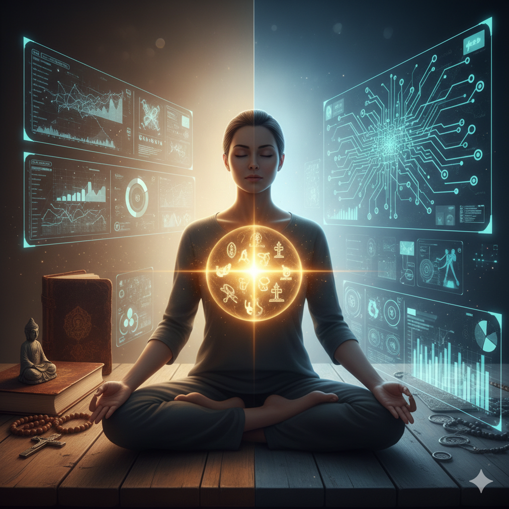 - Image Info (English): On the left side of the screen are traditional religious symbols like old scriptures, prayer beads, and crosses. On the right are modern data charts and neural network circuits. In the center, a person sits in meditation, with a glowing golden sphere in their chest where everything merges. A scene of 'knowledge fusion' where the heritage of the past meets modern data (Jung-beop) to create new wisdom energy.