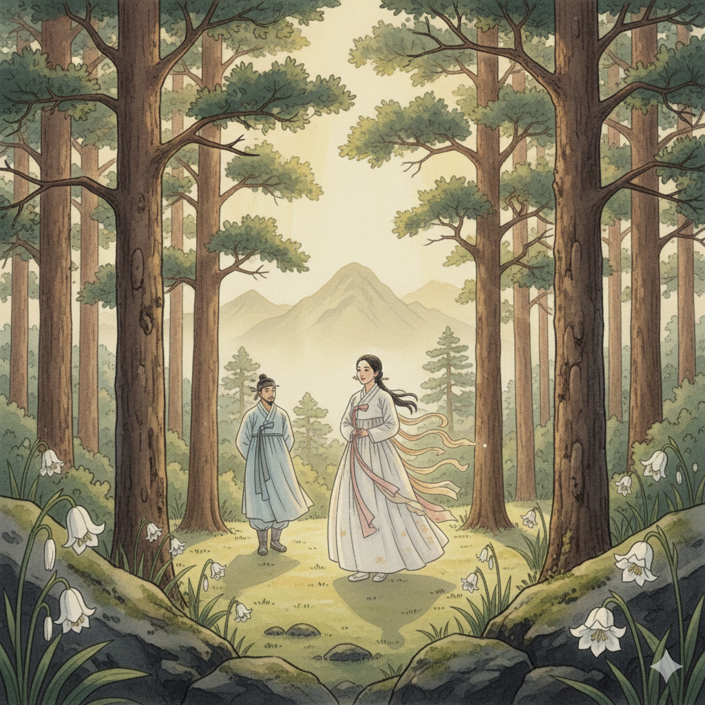 - 영어: In the mountains of ancient Korea, a young scholar in hunting attire gazes into a lush forest. Beside him, a woman in elegant Hanbok stands in a mystical aura. A serene temple is faintly visible in the background. The overall image emphasizes soft, Oriental painting-style colors and a lyrical atmosphere, capturing the fated encounter and narrative of enlightenment within the tale.