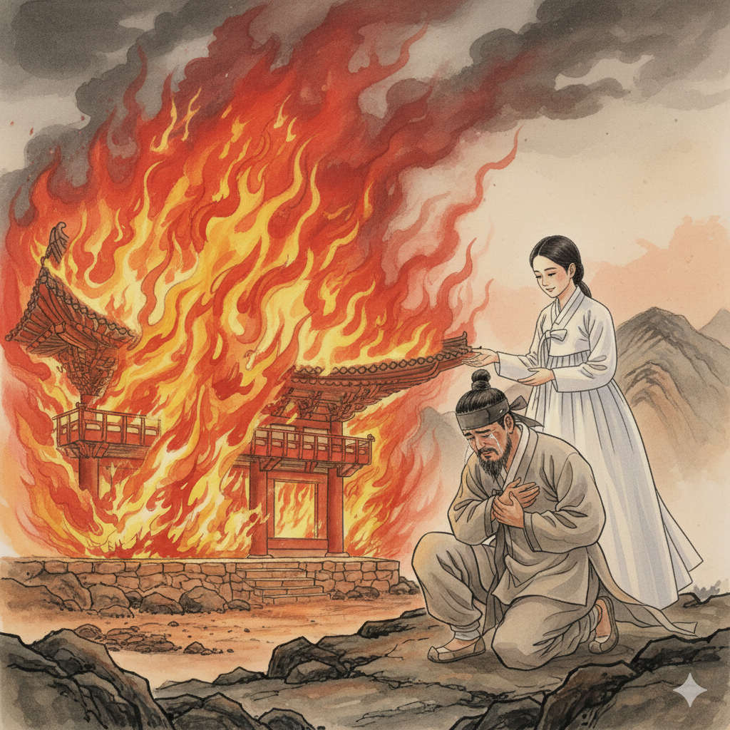 - 이미지 정보(EN): The devastated lord in front of a burning temple, and the lady giving him teachings with a merciful smile by his side.