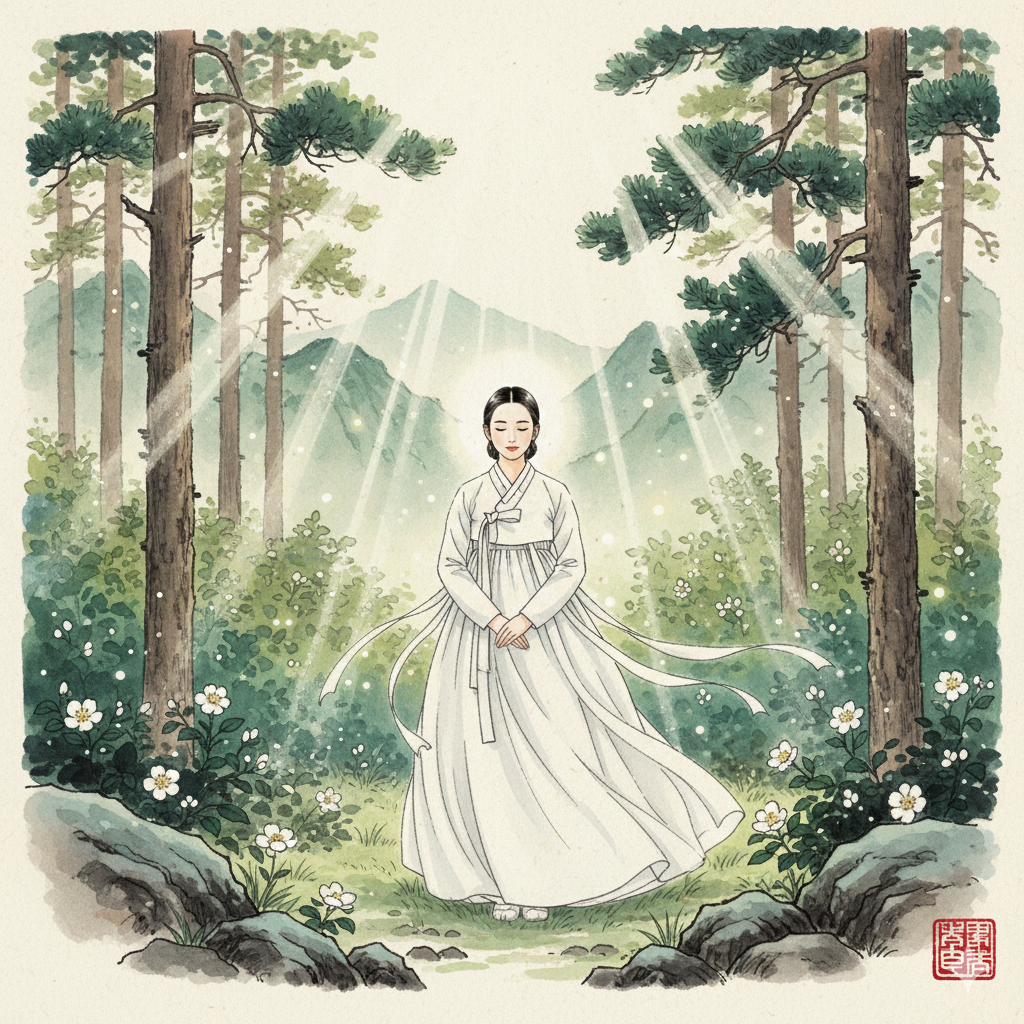 - 한국어: 고즈넉한 사찰의 대웅전 앞, 정갈한 한복을 입은 선비가 바위 틈에 피어난 하얀 버선꽃을 경건하게 바라보고 있습니다. 선비의 뒤편으로는 은은한 후광을 띈 관세음보살의 실루엣이 구름 사이로 보이며, 세속의 번뇌가 맑은 지혜로 승화되는 순간을 따뜻하고 신비로운 동양화풍으로 묘사합니다. (약 180자)