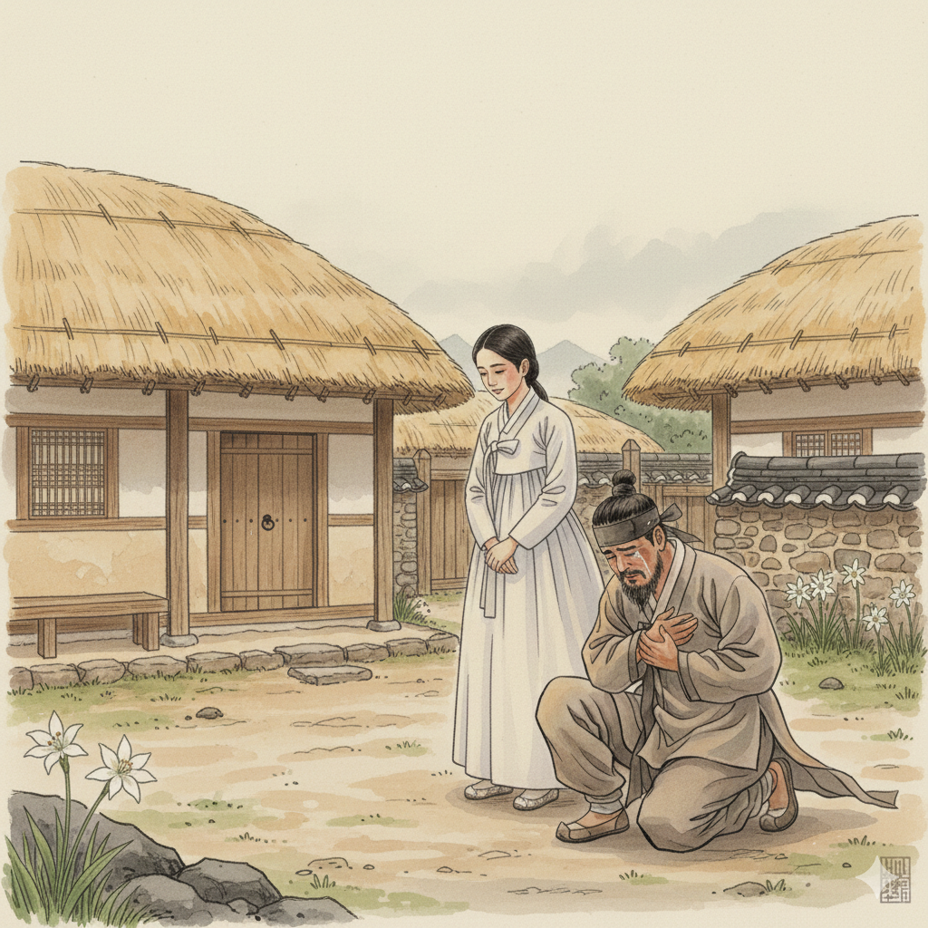 - 이미지 정보(KR): 낭자의 집 마당에서 정중하게 청혼하는 도령과 진지한 표정으로 불사를 제안하는 한복 입은 낭자.