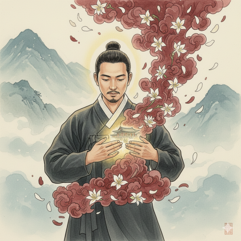 - English: Lord Sudeok in silk Hanbok looks into his own chest, where a miniature Sudeoksa temple rises glowing from his heart. Red smoke symbolizing secular troubles scatters around the temple, turning into white Beoseon-flower petals as it rises to the sky. It is a surreal scene announcing the completion of an inner sanctuary, set in a mysterious and serene atmosphere.
