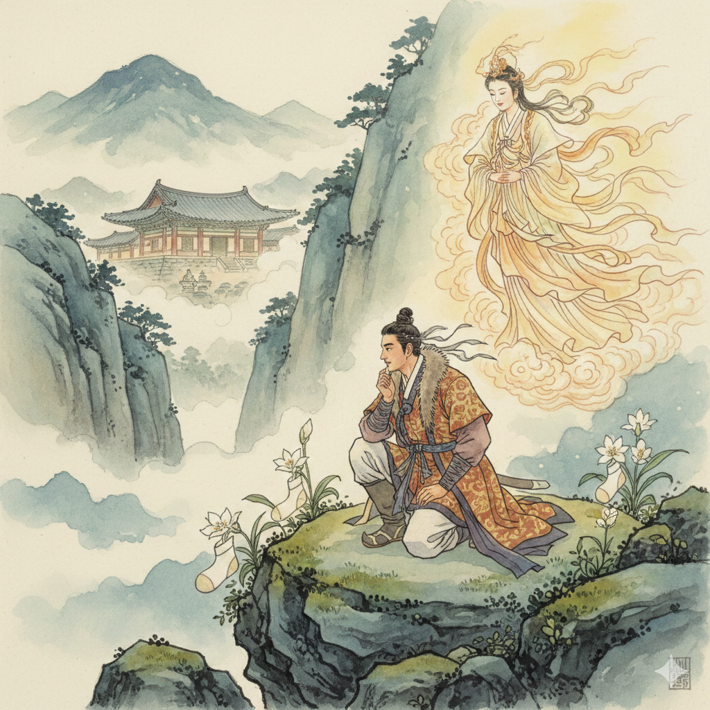 [이미지 생성 텍스트] 신비로운 덕숭산의 절벽 아래, 정갈한 도포를 입은 수덕 도령이 바위 틈에서 피어난 하얀 버선꽃을 경이롭게 바라보고 있습니다. 꽃 주변에는 은은한 금빛 서기가 감돌며, 하늘에는 관세음보살의 인자한 실루엣이 구름 사이로 비칩니다. 동양적인 수묵 채색화 기법으로 숭고하고 아름다운 불교적 정취를 담아냅니다.