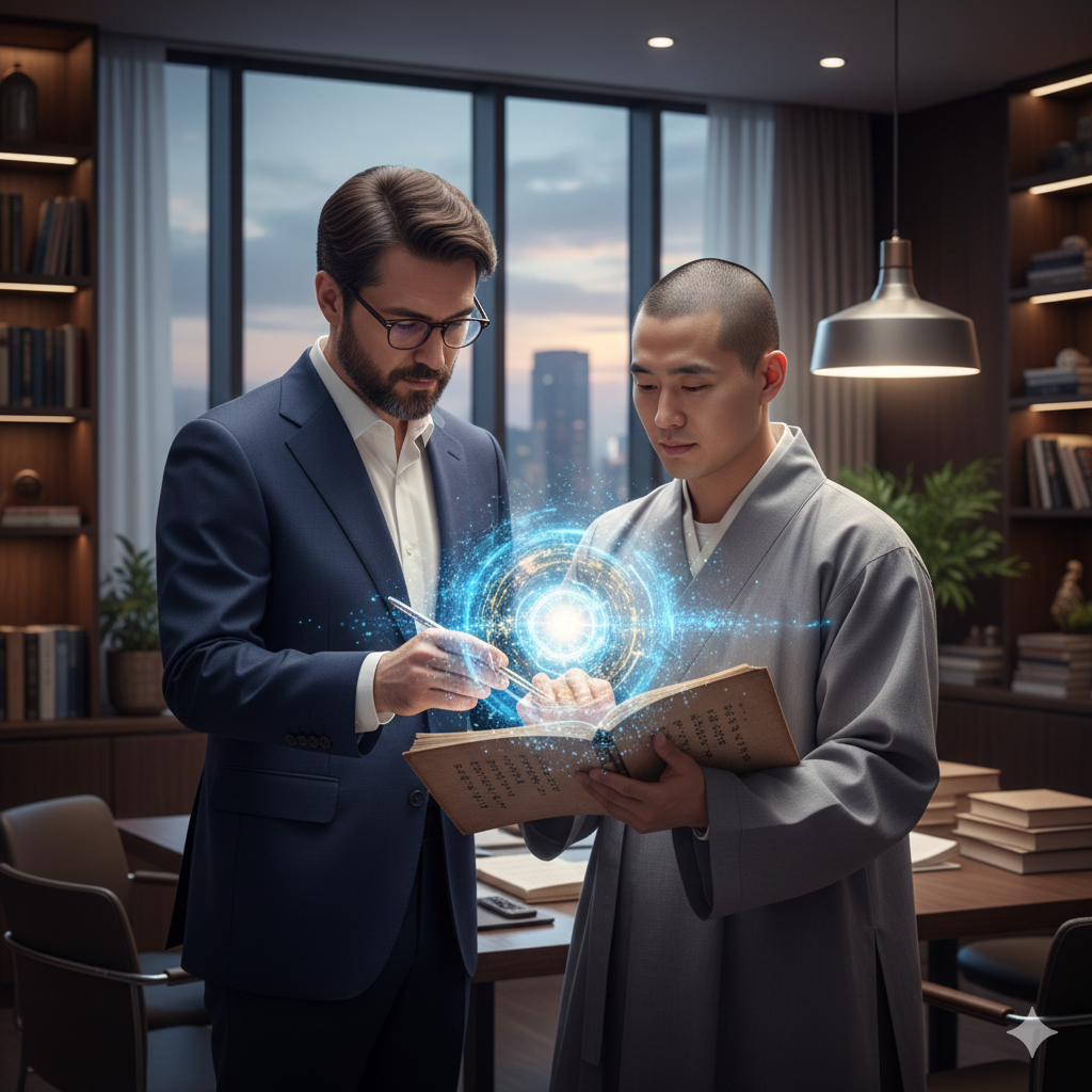[이미지 생성 정보 / Image Generation Prompt] 현대적인 서재에서 학자와 수행자가 함께 오래된 경전을 연구하며 대화하는 모습입니다. 학자는 깔끔한 정장을, 수행자는 단아한 법복을 입고 있으며 배경에는 우주의 성운과 원소 에너지가 결합하는 형상이 홀로그램처럼 펼쳐져 지식의 융합을 상징합니다. A scholar and a practitioner study and discuss ancient scriptures together in a modern study. The scholar wears a neat suit, and the practitioner wears elegant, simple traditional robes. In the background, a hologram of cosmic nebulas and elemental energies merging symbolizes the fusion of old and new knowledge.