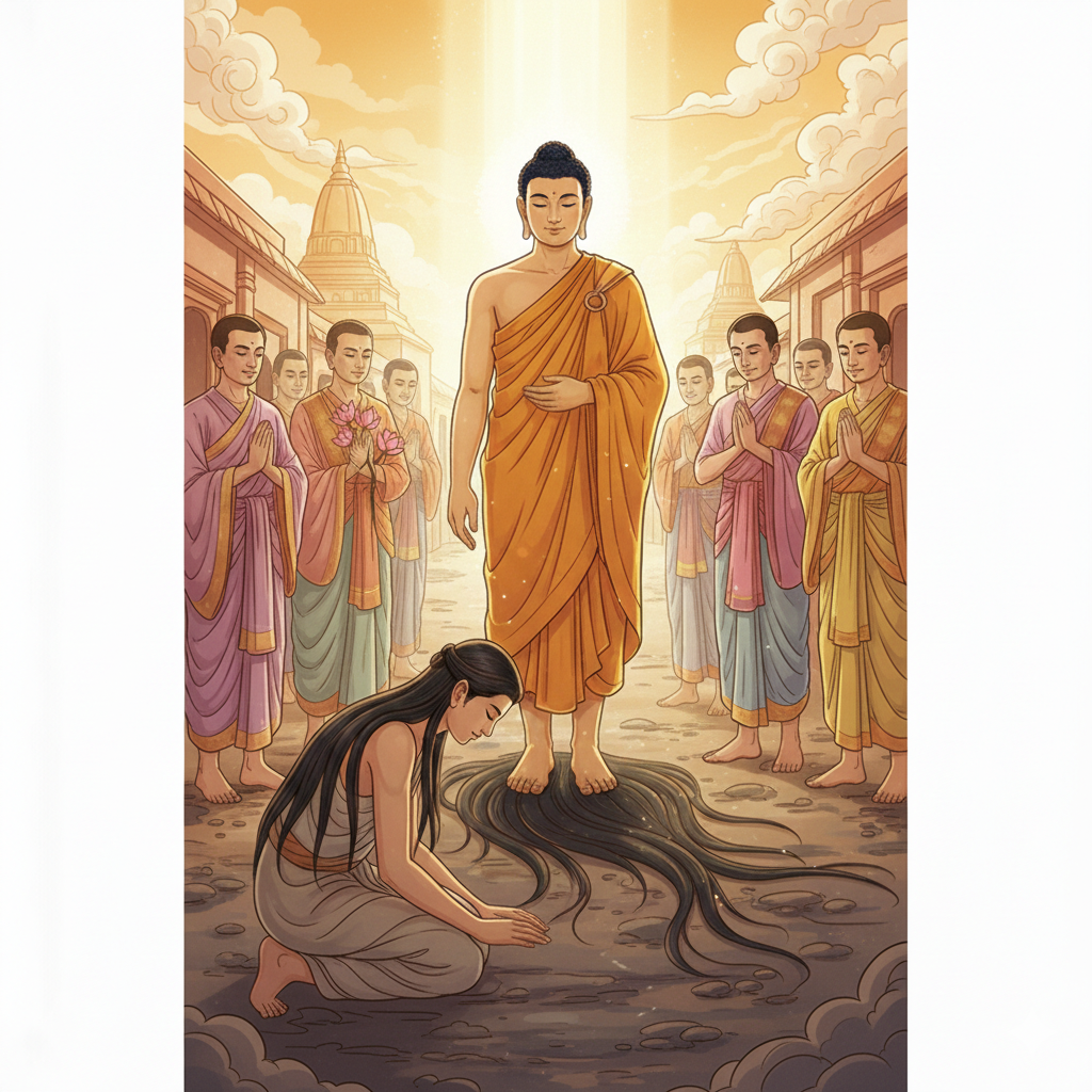 - 한글: 진흙길 위에 자신의 긴 머리카락을 정성껏 펼쳐 정광여래의 발을 맞이하는 유동의 숭고한 모습. 부처님은 자비로운 미소를 짓고 있으며, 주위에는 고대 인도의 전통 의상을 입은 제자들이 경외심 어린 표정으로 서 있음. 신성한 빛이 화면을 가득 채우는 현대적인 불교 예술 화풍의 삽화.