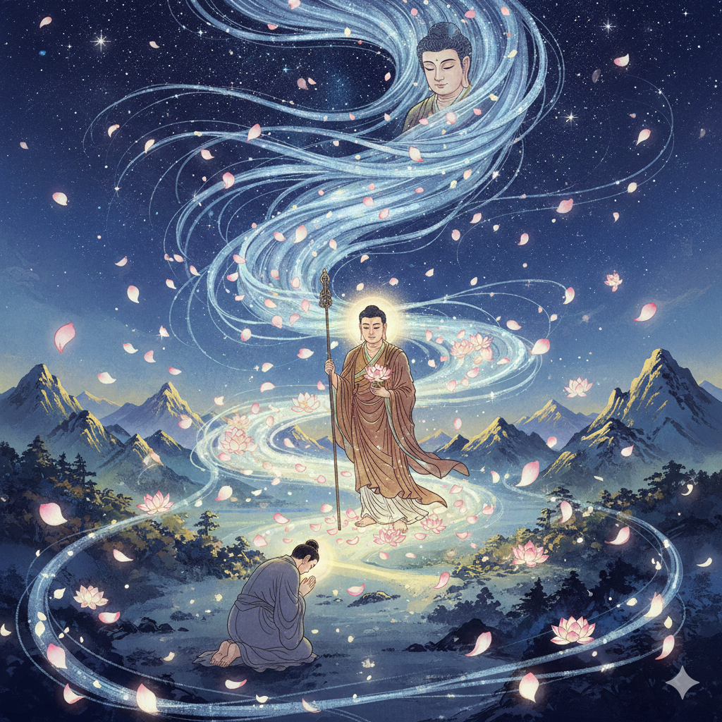 - English: A surreal landscape where the Milky Way turns into Yudong's hair descending to earth for Dipankara Buddha to walk upon. Yudong bows piously, with fluttering lotus petals blending with modern graphic effects in a dreamy and beautiful illustration.