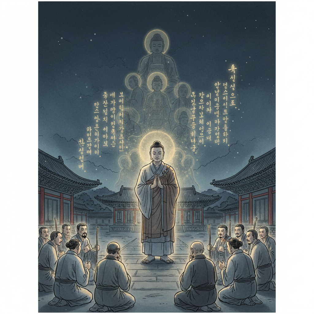 Image Description: In a tranquil ancient Eastern temple courtyard under the night sky, Bodhisattva Sangbulgyeong stands in humble monastic robes, hands neatly joined. Around him, verses from the poem float translucently in the air, glowing in Korean calligraphy. At his feet, various figures initially critical now kneel with increasing reverence. Faintly, a myriad of Buddha forms hover like an aura behind the Bodhisattva, creating a serene yet mystical night scene rendered in a delicate East Asian digital illustration style.