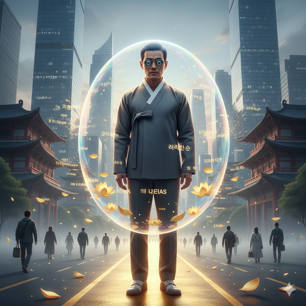 Image Description: Against a background where modern skyscrapers and ancient temples dreamily overlap, Bodhisattva Sangbulgyeong stands wearing a grey suit-style modern Hanbok. Around him, words of criticism floating like digital noise turn into golden lotus petals upon touching his transparent, bubble-like protective shield. The Bodhisattva's eyes are depicted as precise as camera lenses yet as clear as a lake, seemingly piercing through the essence of the world. A golden path starts from his feet and extends through the grey modern streets, illuminating people's footsteps in a surreal digital art piece filled with hope.