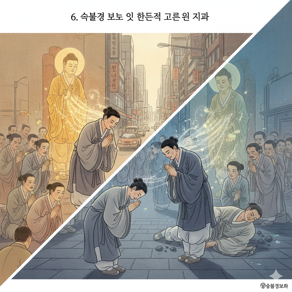 Image Description: The screen is divided diagonally; on the left (positive), a sacred scene shows the golden compassion of Bodhisattva Sangbulgyeong turning the hearts of angry people into lotuses. On the right (negative), under a cold blue light, the Bodhisattva is shown falling while being hit by stones, contrasted with the skeptical gazes of modern people. This image features a three-dimensional composition that juxtaposes classical Buddhist art styles with cold modern art textures, simultaneously showing sublime religious values and realistic critical perspectives.