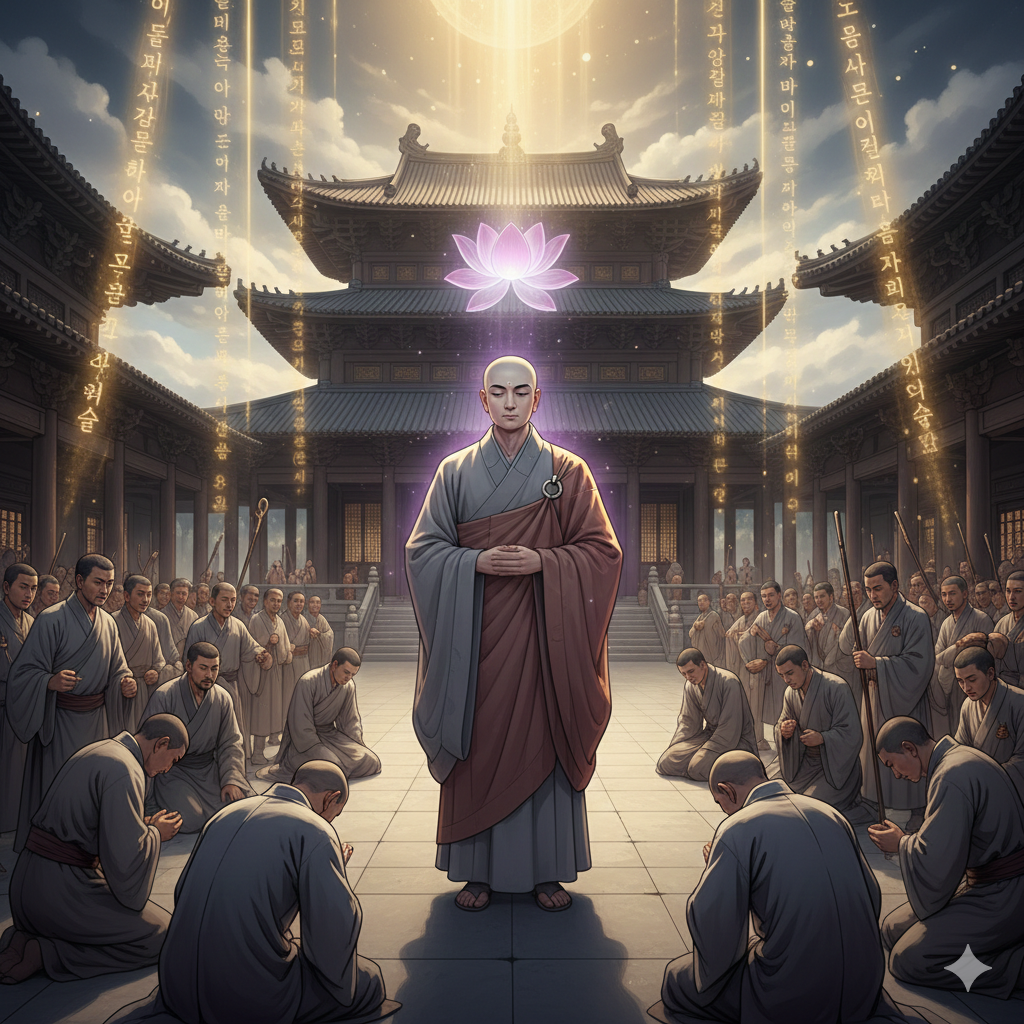 이미지 설명: 화려하고 성스러운 대승국의 사원 마당을 배경으로, 소박하고 단정한 회색 승복을 입은 상불경 보살이 중심에 서 있습니다. 그의 머리 위로는 '불성(佛性)'을 상징하는 투명한 연꽃이 떠 있고, 보살의 몸에서는 '인욕(忍辱)'을 상징하는 은은한 보랏빛 기운이 뿜어져 나옵니다. 주변에는 지팡이를 든 화난 군중과 무릎을 꿇은 참회자들이 공존하며, 하늘에는 '법화경(法華經)'의 구절이 황금색 빛줄기가 되어 대지로 내려오는 현대적이고 철학적인 비주얼의 디지털 아트입니다.