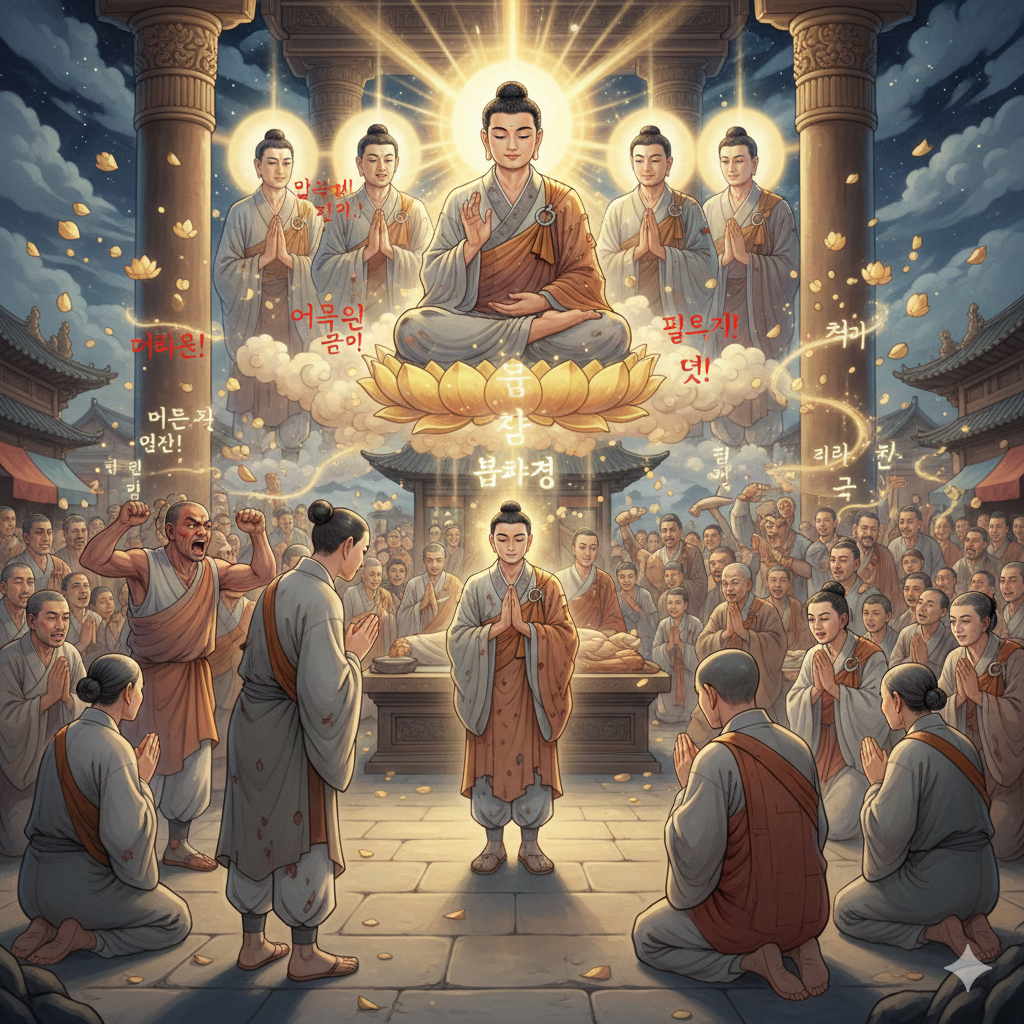Image Description: Against the backdrop of a temple courtyard in the sacred kingdom of Daeseung, Bodhisattva Sangbulgyeong stands central in neat grey monastic robes. Above his head floats a transparent lotus symbolizing 'Buddha-nature,' while a subtle purple aura representing 'Patience' emanates from his body. Around him, angry crowds with sticks and kneeling penitents coexist. In the sky, verses from the 'Lotus Sutra' descend to earth as golden streaks of light, creating a modern and philosophical digital art visual.