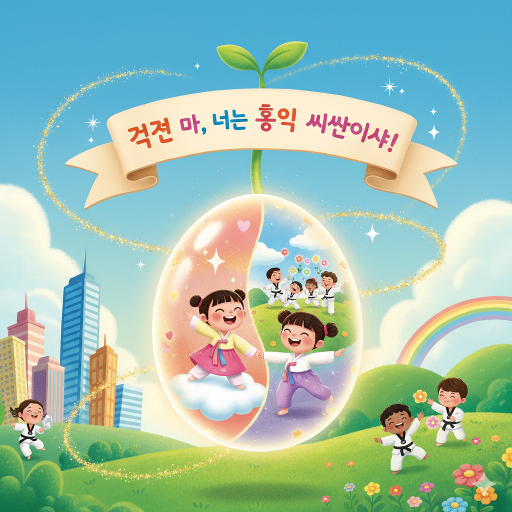 - English: At dawn where a modern city meets peaceful nature, a giant transparent seed floats. Inside the seed, one side shows two sisters in elegant modern Hanbok reverently making a 'Hongik-Sahaeng-do' vow, while the other side shows cute children from a storybook joyfully laughing and playing in Taekwondo uniforms, reflected like holograms. The phrase 'Don't worry, you are a Hongik Seed!' is warmly inscribed on the seed's surface, and golden life energy emanating from the seed embraces the entire book, symbolizing a hopeful future. (Approx. 400 characters with spaces)