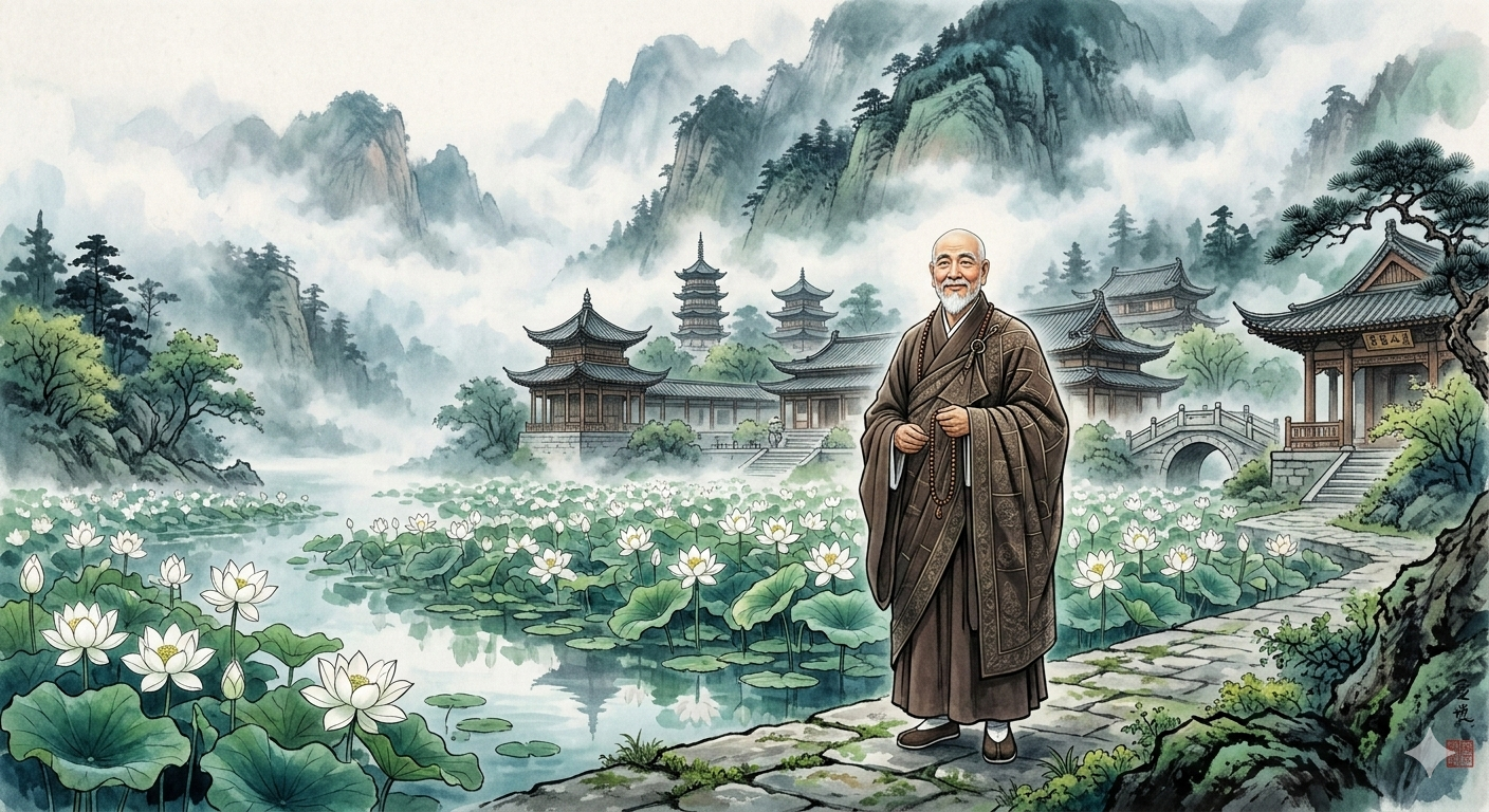 - English: A high-resolution illustration of Master Huiyuan standing serenely in front of Donglin Temple on the misty Mount Lushan. He is wearing traditional, neat Buddhist robes. In the background, white lotuses bloom in a pond, symbolizing the White Lotus Society, captured in a modern and mystical style.