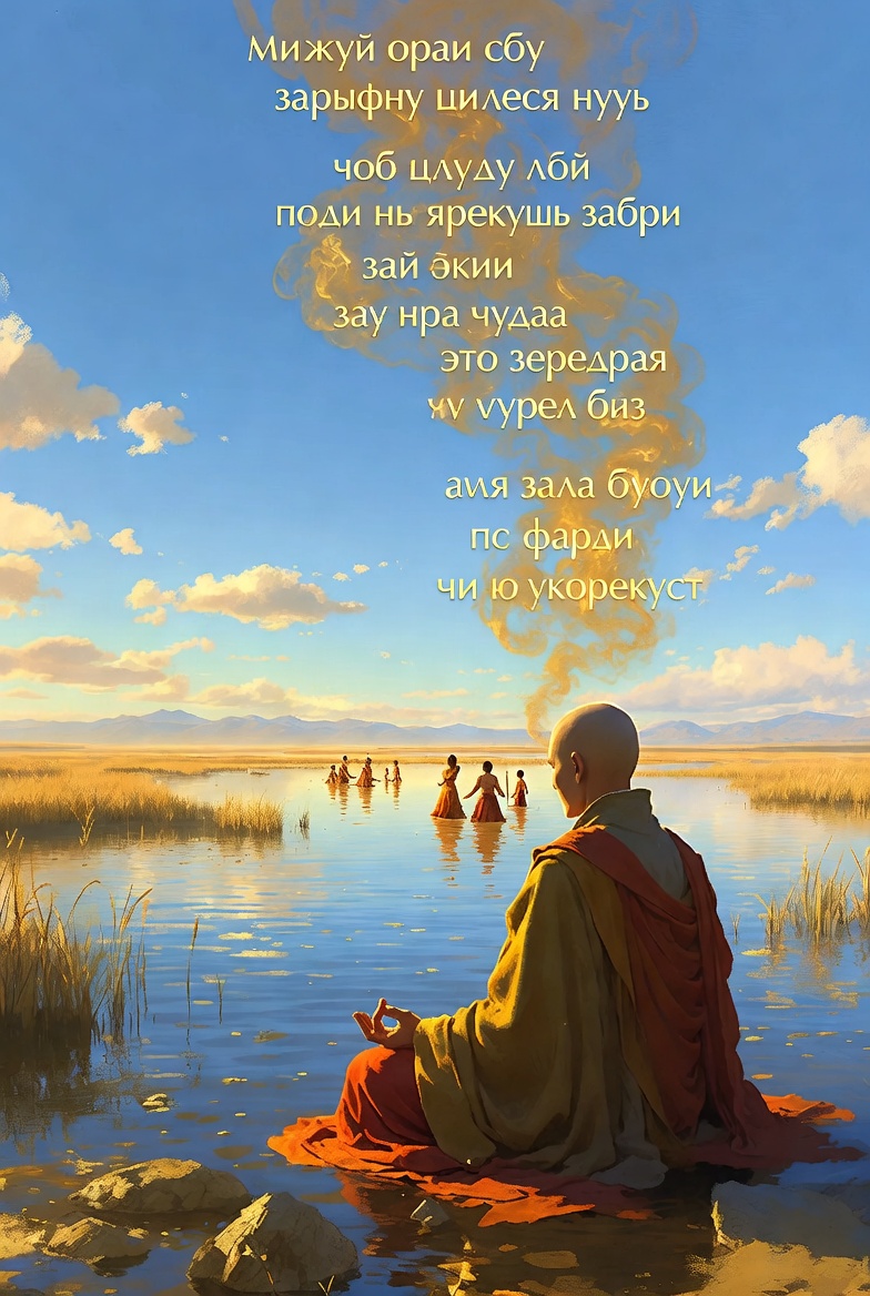 By a calm lakeside reflecting the blue sky, a monk in traditional robes meditates as poetic verses rise like golden smoke and spread into the air. Glorious illusions of the past Mongol Empire shimmer on the lake, while children play peacefully in front of the monk. He wears traditional silk monastic robes, and warm sunlight envelops everything in this peaceful, lyrical digital painting.