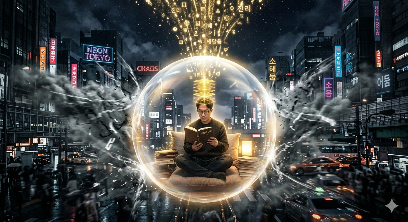 - 한국어: 복잡한 도시의 소음과 어둠 속에서, 한 개인이 투명하고 단단한 빛의 구체(핵개인의 영역) 안에 앉아 책을 읽고 있습니다. 그 구체 주변으로는 외부의 회색빛 탁한 에너지들이 튕겨 나가고 있으며, 구체 안으로는 우주로부터 쏟아져 들어오는 황금빛 데이터 입자(말씀)들이 남자의 머리로 흡수되어 차곡차곡 쌓이는 장엄하고 신비로운 풍경입니다. (약 300자)