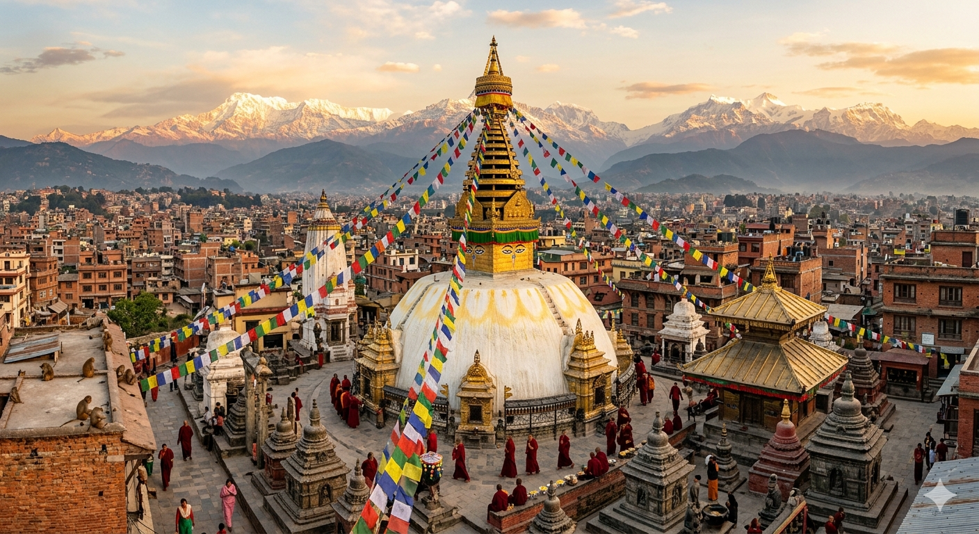 A grand view of Swayambhunath Stupa in Kathmandu Valley, Nepal, with the snowy Himalayas in the background. The golden spire features the compassionate eyes of Buddha looking in four directions, and colorful prayer flags flutter in the breeze. Monks in neat traditional robes and Hindu-style stone temples coexist around the stupa, creating a mysterious and peaceful atmosphere of religious harmony. (295 characters)