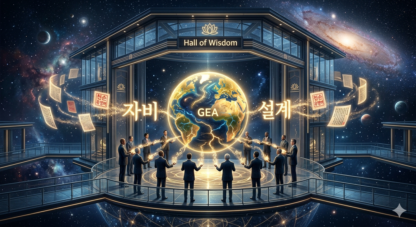 이미지 설명: 거대한 우주적 사찰의 대웅전 대신, 현대적인 유리 벽으로 된 '지혜의 전당'이 서 있습니다. 전당 안에는 불상 대신 거대한 황금빛 지구본이 떠 있고, 그 주위를 현대적인 수트를 입은 리더들이 둘러싸고 있습니다. 리더들의 손에서는 '자비'와 '설계'라는 글자가 빛의 입자가 되어 흘러나와 지구의 갈라진 틈을 메우고 있습니다. 배경에는 '천손(Heavenly Leader)'이라는 낙인이 찍힌 고서들이 홀로그램으로 유영하며, 고대의 영성과 미래의 책임감이 하나로 어우러지는 장엄한 고해상도 이미지입니다.