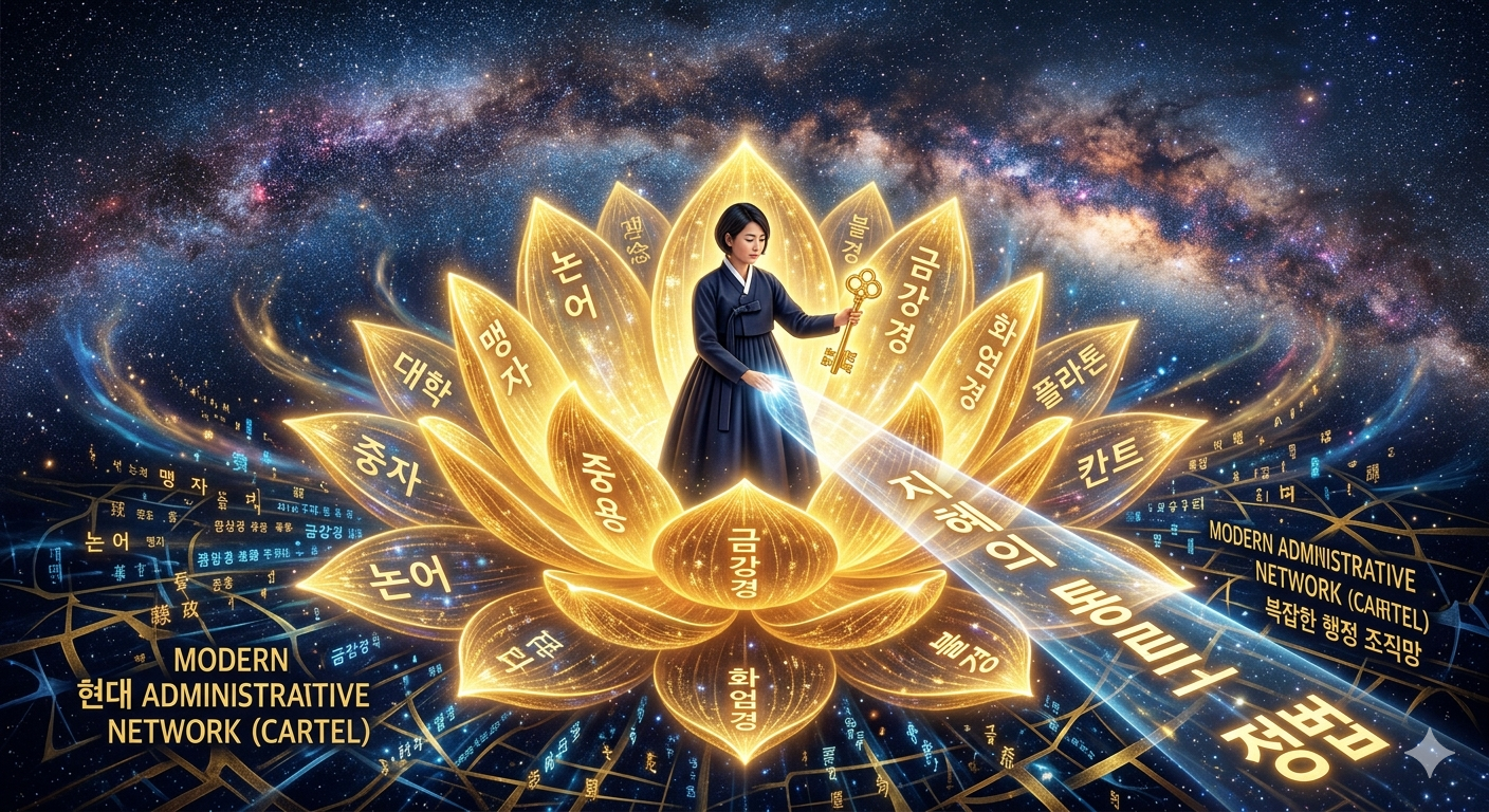 거대한 황금빛 '연꽃'이 우주 공간에 피어 있고, 그 꽃잎마다 동양의 사서오경과 불교 경전, 서양의 철학서들이 입체적인 홀로그램으로 떠올라 찬란한 빛을 내뿜고 있습니다. 연꽃의 중심에는 단정한 개량 한복을 입은 수행자가 '이념'이라는 열쇠를 손에 쥐고, 현대 사회의 복잡한 행정 조직망(카르텔)을 통과하며 투명하고 깨끗한 '지혜의 통로'를 열고 있습니다. 배경으로는 2026년의 은하수가 장엄하게 흐르며 시대를 관통하는 진리가 하나로 합쳐지는 성스러운 풍경입니다. 인물은 정갈하게 옷을 입고 있으며, 모든 고전의 지혜가 오늘날의 정법으로 수렴되는 압도적인 분위기입니다.