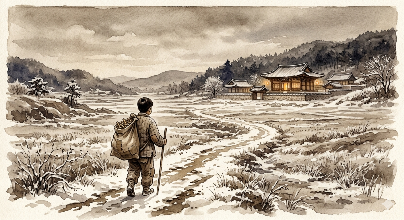 1960년대 철원의 황량한 겨울 들판과 그 너머로 보이는 고즈넉한 도피안사의 전경을 묘사합니다. 화면 중앙에는 낡은 누비옷을 입고 탄피 자루를 멘 소년이 법당의 은은한 불빛을 향해 걸어가는 뒷모습이 보입니다. 전체적으로 세피아 톤의 따뜻한 감성과 신비로운 영험함이 느껴지는 수채화 스타일로 표현합니다. The image depicts a desolate winter field in Cheorwon in the 1960s with the quiet Dopiansa Temple in the background. In the center, a boy in a worn quilted coat carries a sack of bullet casings, walking toward the soft light of the temple. The scene is rendered in a warm, sepia-toned watercolor style, evoking a sense of nostalgic mystery and divine grace.