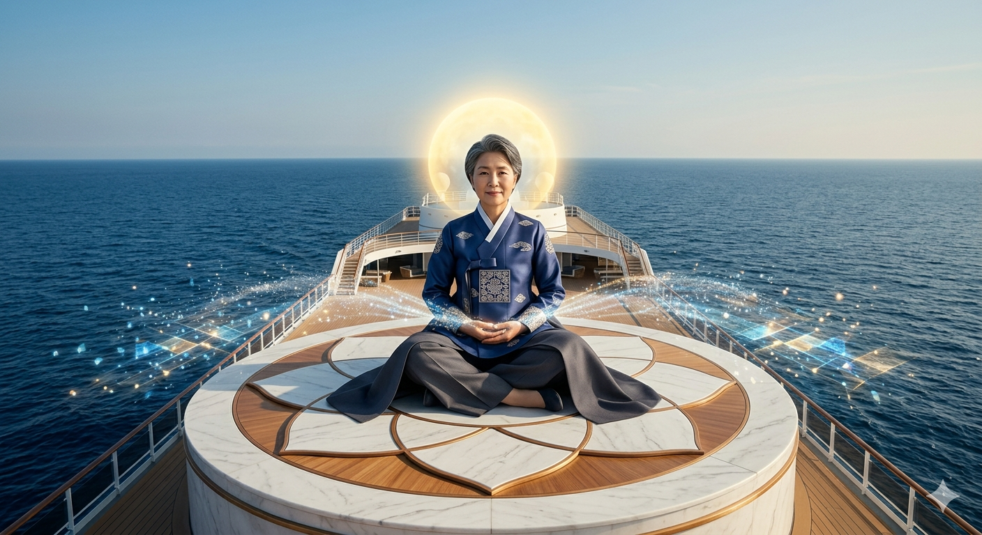 [한글 설명] 끝없는 수평선이 펼쳐진 푸른 바다 위, 연꽃 대신 거대한 크루즈선이 떠 있고 그 중심에 현대적 한복 수트를 입은 사회 부모가 정좌하고 있습니다. 그의 머리 위로는 70%의 황금빛 지혜 에너지가 후광처럼 빛나고 있으며, 손끝에서는 인류의 모순을 녹여내는 빛의 입자들이 퍼져 나갑니다. 동양의 숭고한 종교적 미학과 현대적 세련미가 결합된 300자 내외의 장면으로, 의복은 매우 정갈하고 품격 있습니다.
