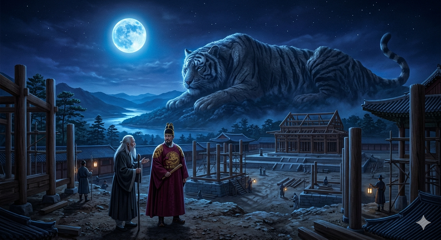 - 한국어: 달빛이 비치는 밤, 거대한 호랑이 형상을 한 호암산의 능선이 한양의 궁궐 터를 위엄 있게 내려다보고 있는 신비로운 분위기의 이미지입니다. 산 아래에는 전통 한복을 입은 태조 이성계가 흰 수염을 길게 늘어뜨린 노인과 마주 서서 대화를 나누고 있습니다. 태조는 왕의 복식인 곤룡포를 갖춰 입었으며, 주변에는 공사 중인 궁궐 기둥들이 보입니다. 신비로운 푸른 달빛이 전체적인 풍경을 감싸며 장엄하고 전설적인 느낌을 줍니다.
